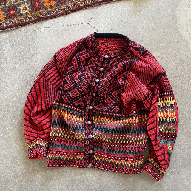 90s hand made nordic knit cardigan 1980〜90年代くらいおそらくEUROもの 手編み、ハンドメイドのノルディックセーター ざっくりふわふわ、肉厚ですが チクチクしない滑らかなウール素材で サラッと羽織れるニットカーディガン 全体的にジグザグ△模様が入っているのがめちゃくちゃ可愛いです! メタルボタンも凝った装飾で高級感あります 身長158cmで着用しています レディースですがユニセックス男女兼用でお使い頂けるデザインかと思います 袖、着丈長めですのでメンズMくらいの方も着用出来ると思います 大変おすすめ○○ ●サイズ 表記 無し Lサイズ相当 実寸サイズ表を必ずご確認ください↓ 着丈(首下中心付け根から裾下)約64cm 肩幅(肩から肩を直線で)約57cm 身幅(脇下から脇下)約53cm 袖丈(肩から袖先)約51cm ※平置き採寸です! 若干の誤差はご了承ください。 ●カラー ブラック 黒 オレンジっぽい赤 マルチカラー ●素材 おそらくウール ●状態 古着ならではの使用感は若干ございますが 特記するダメージ無いと思います。 写真にて全体の雰囲気をご確認ください。 古着慣れしている方なら問題ないコンディションかと思います。 丈夫な素材でまだまだお使い頂けます! ※ヴィンテージ品、海外輸入古着にご理解のある方のみご購入ください。 ●購入後2~3日以内に発送致します ※トラブルを未然に防ぐため、購入前に必ずinformationをご確認下さい。