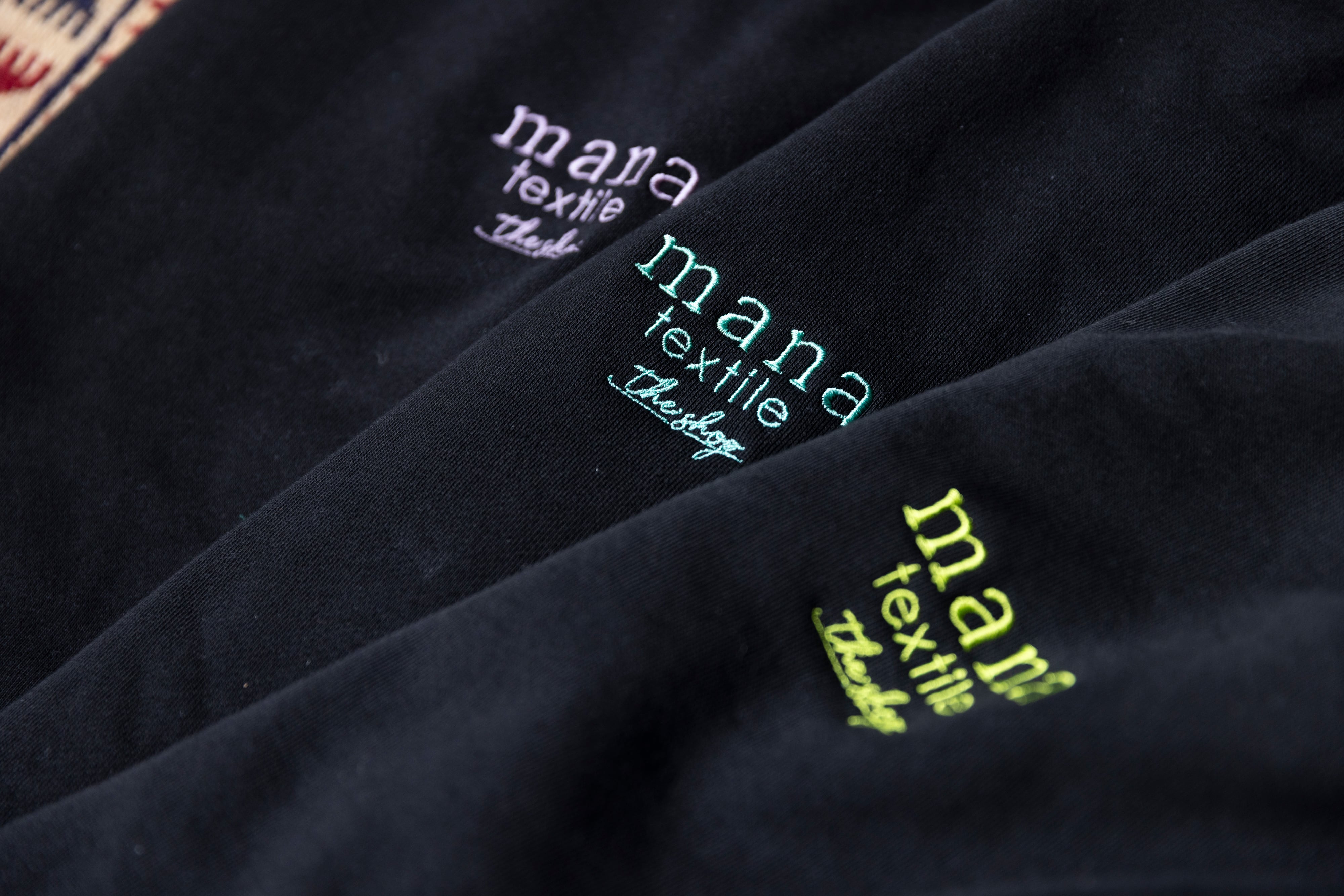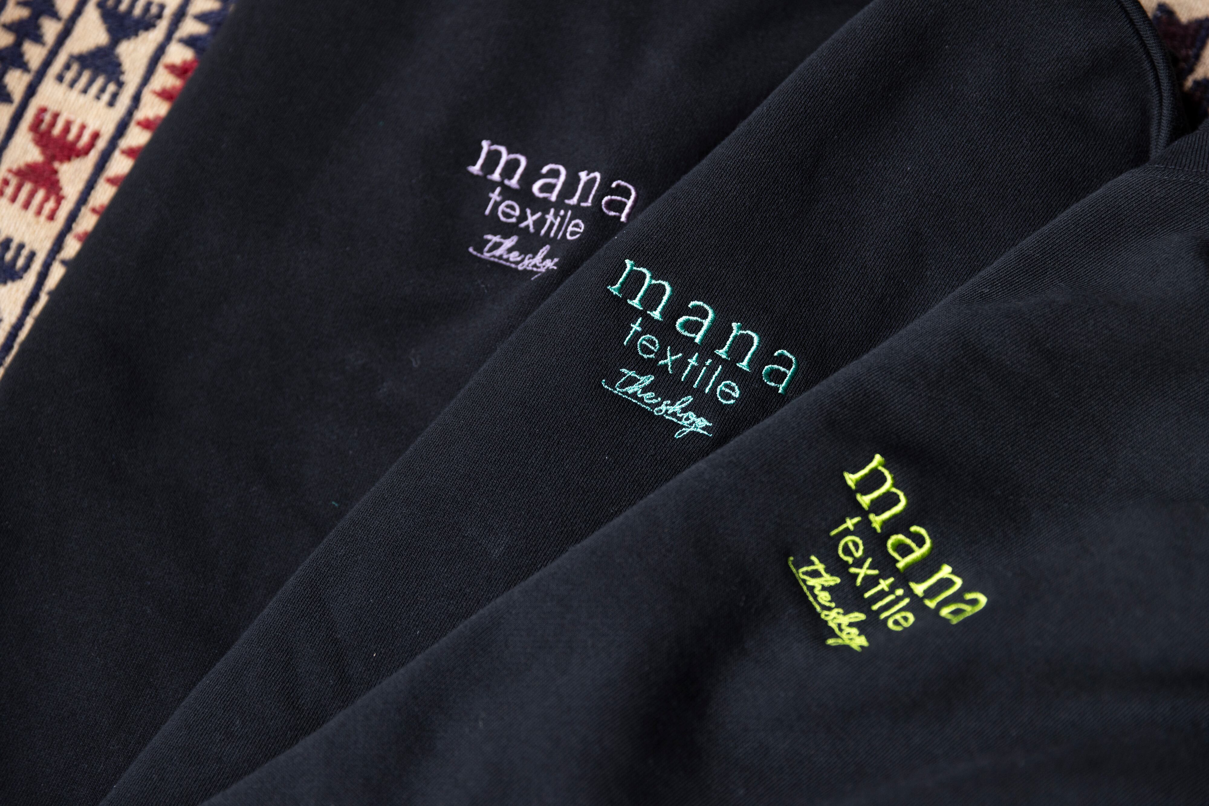 胸元にはmana textileのロゴ刺繍をさりげなく
