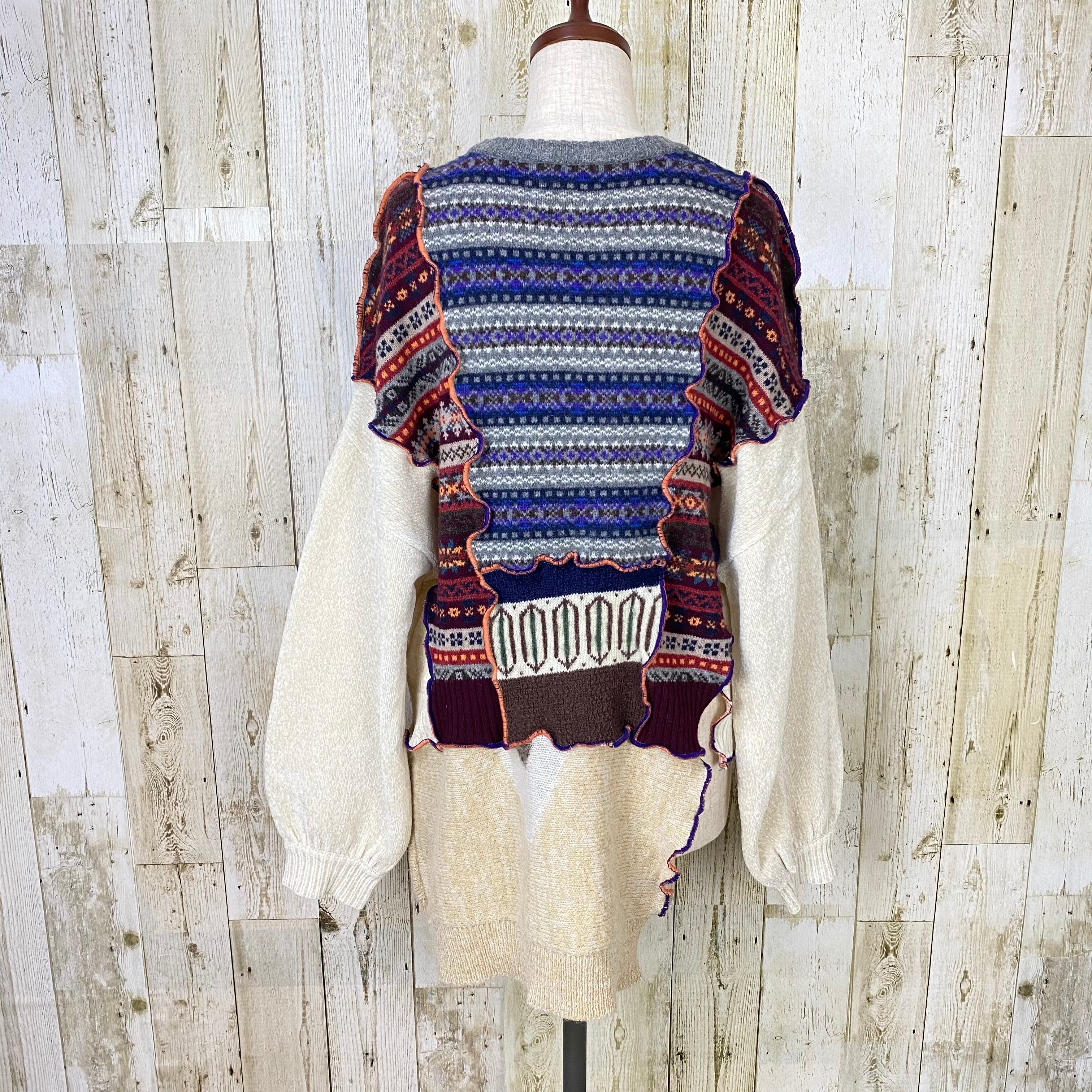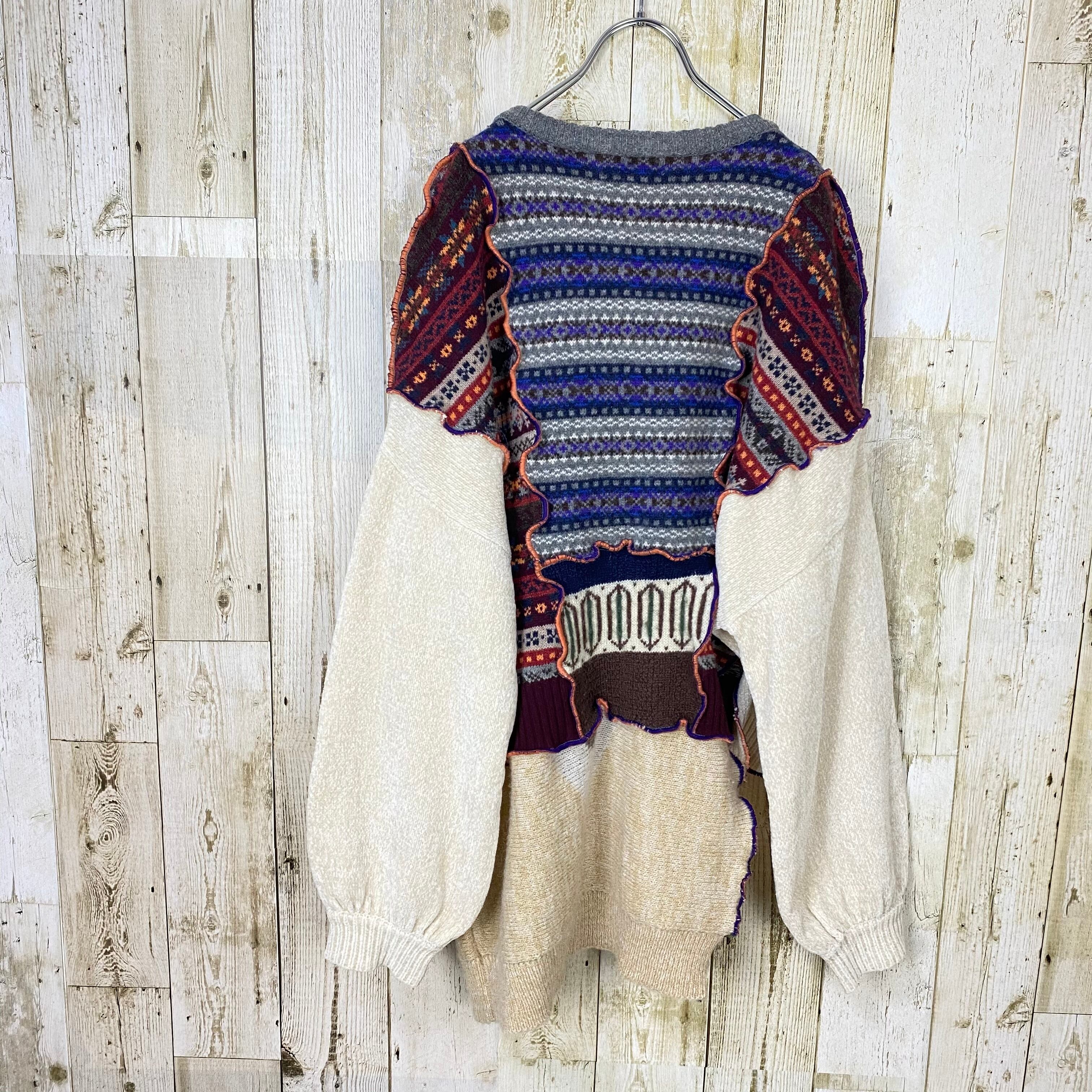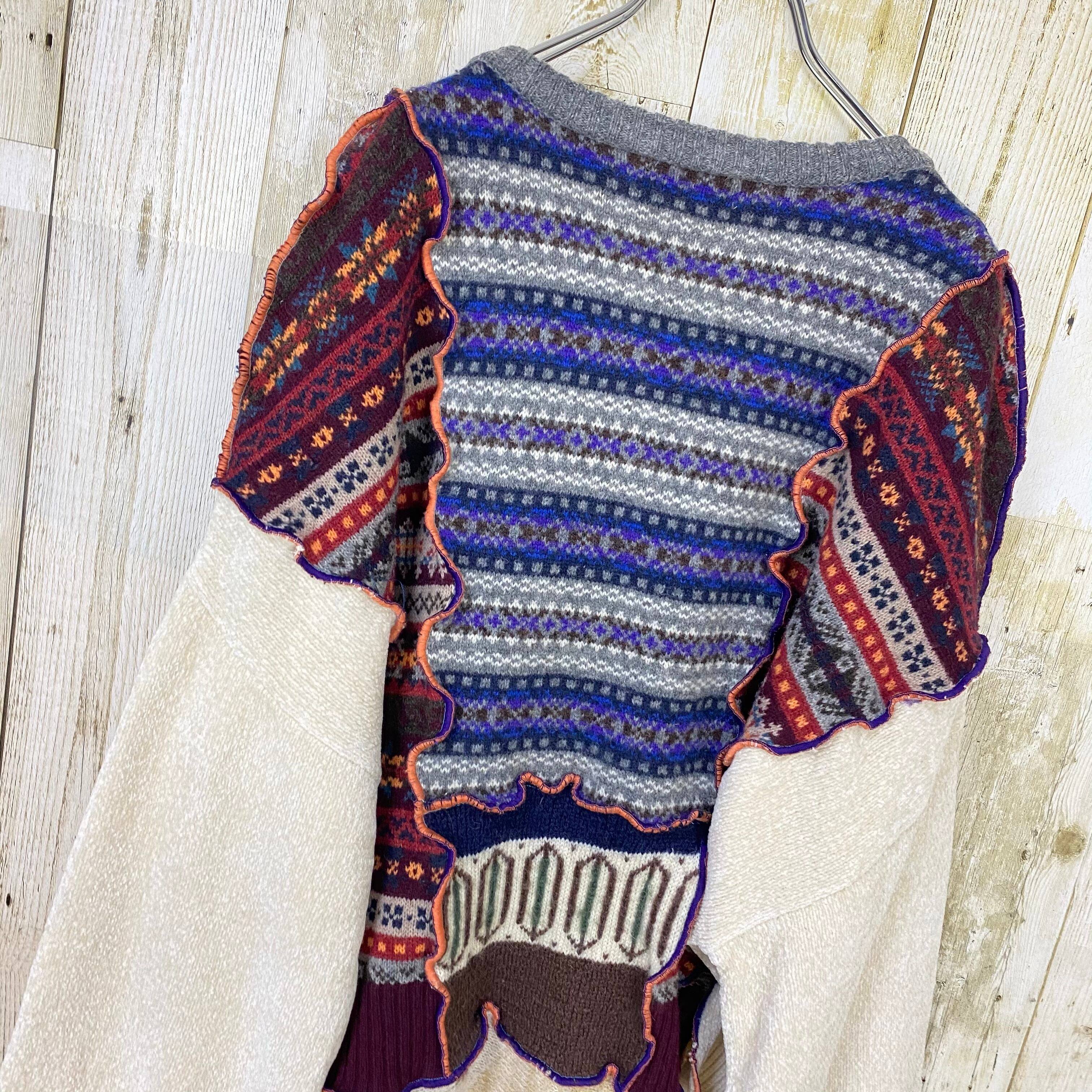 used リメイク パッチワークニット▽▲オフホワイト×フェアアイル▲▽フリーサイズ
