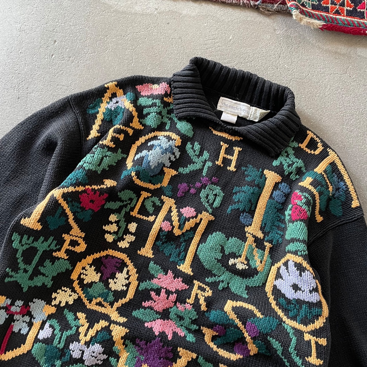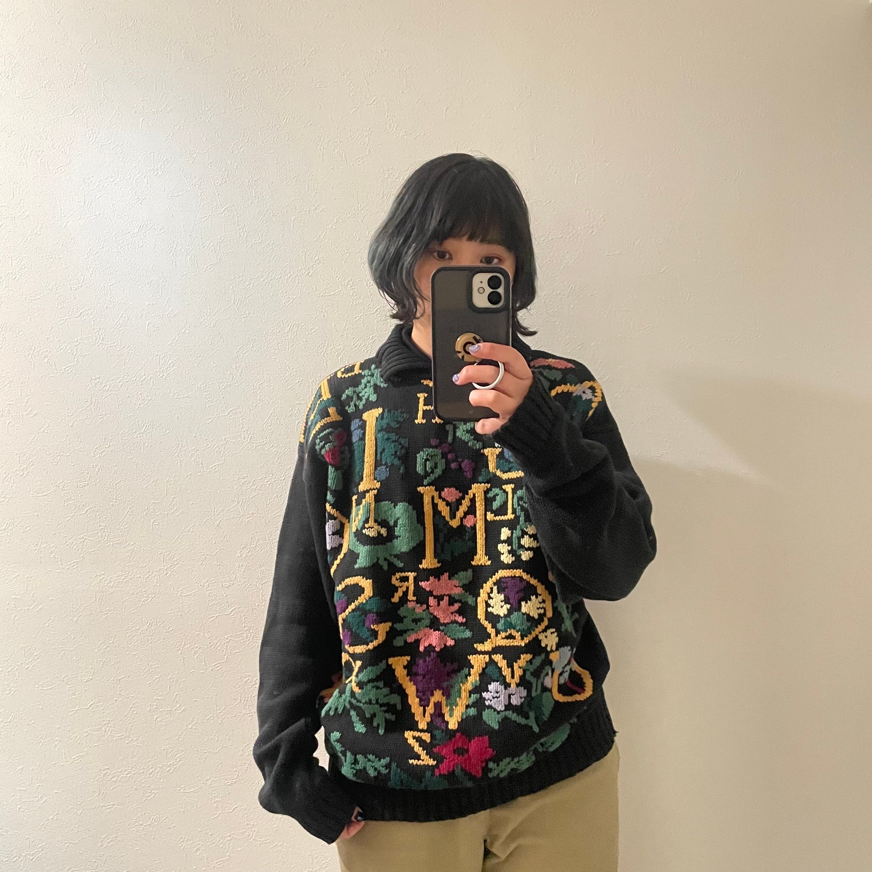 80s hand made alphabet flower stitch cotton knit sweater 英字 花柄 コットンニット セーター 襟付き