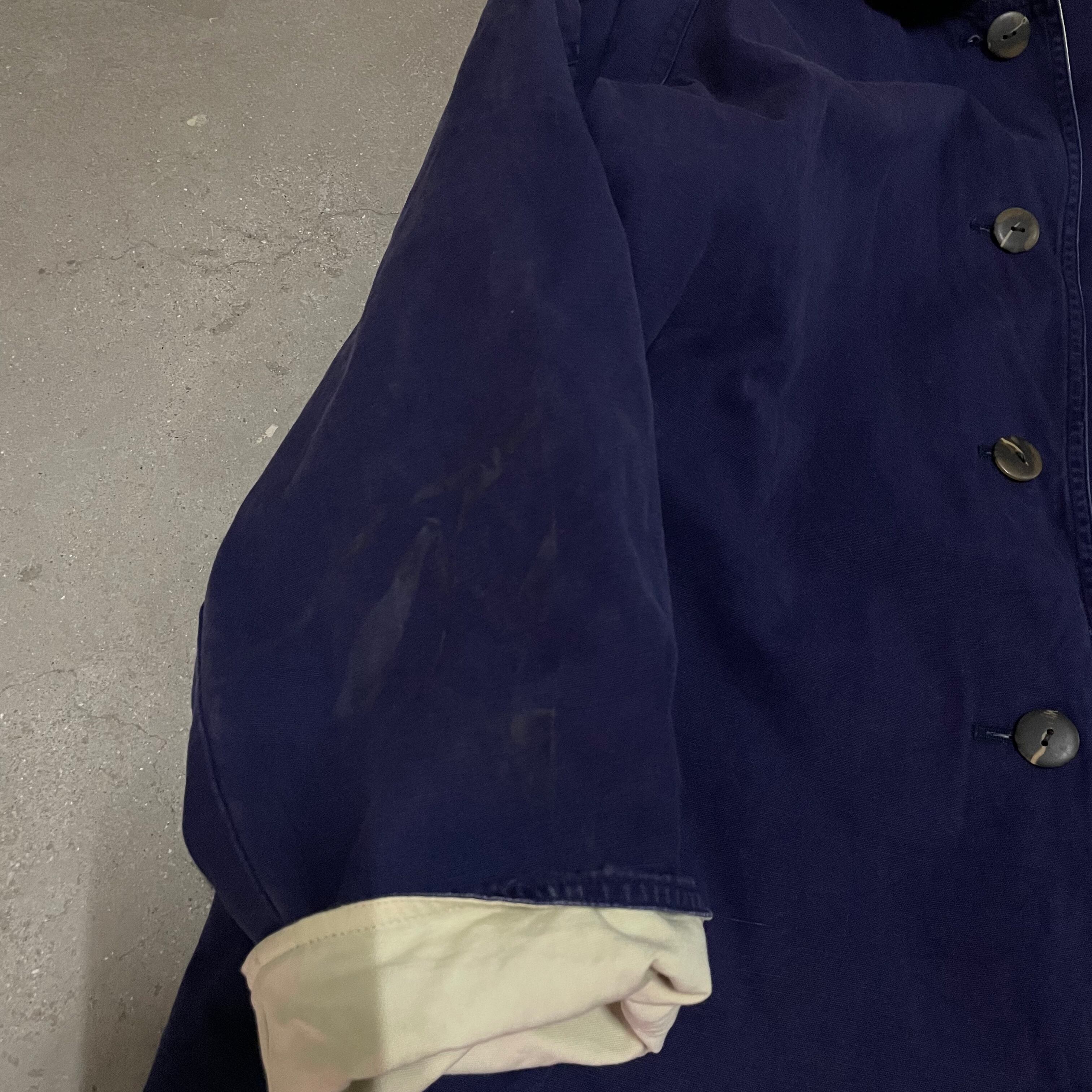 フレンチワークのようなインクブルーに近い紺色に襟のコーデュロイやベージュの配色